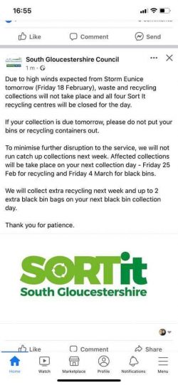 Dodington Parish Council want to share message with residents – that due to Red Weather Warning and Storm Eunice – there will be no waste or recycling collections tomorrow – Friday 18th February 2022.