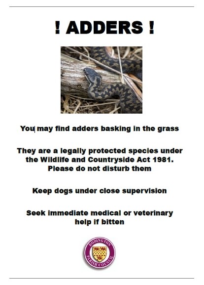 An adder has been sighted close to the Shire Way entrance to Wapley Bushes Nature Reserve (as you cross over the railway bridge and walk down the footpath towards the reserve).