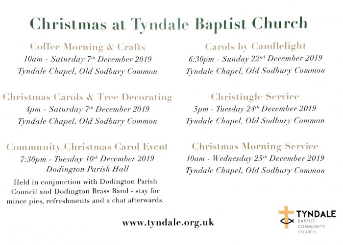 Community Christmas Carol Event – Tuesday 10th December, 7:30pm, Dodington Parish Hall. Hosted by Tyndale Baptist Church in conjunction with Dodington Parish Band and Dodington Parish Council. All welcome to attend this wonderful festive event.