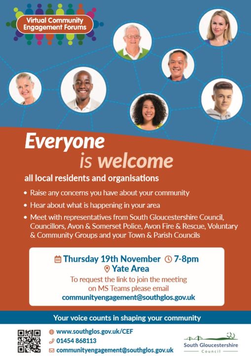 The Community Engagement Forum goes virtual! See the details below for the meeting on Thursday 19th November. All residents and local organisations are welcome to join – please email communityengagement@southglos.gov.uk
