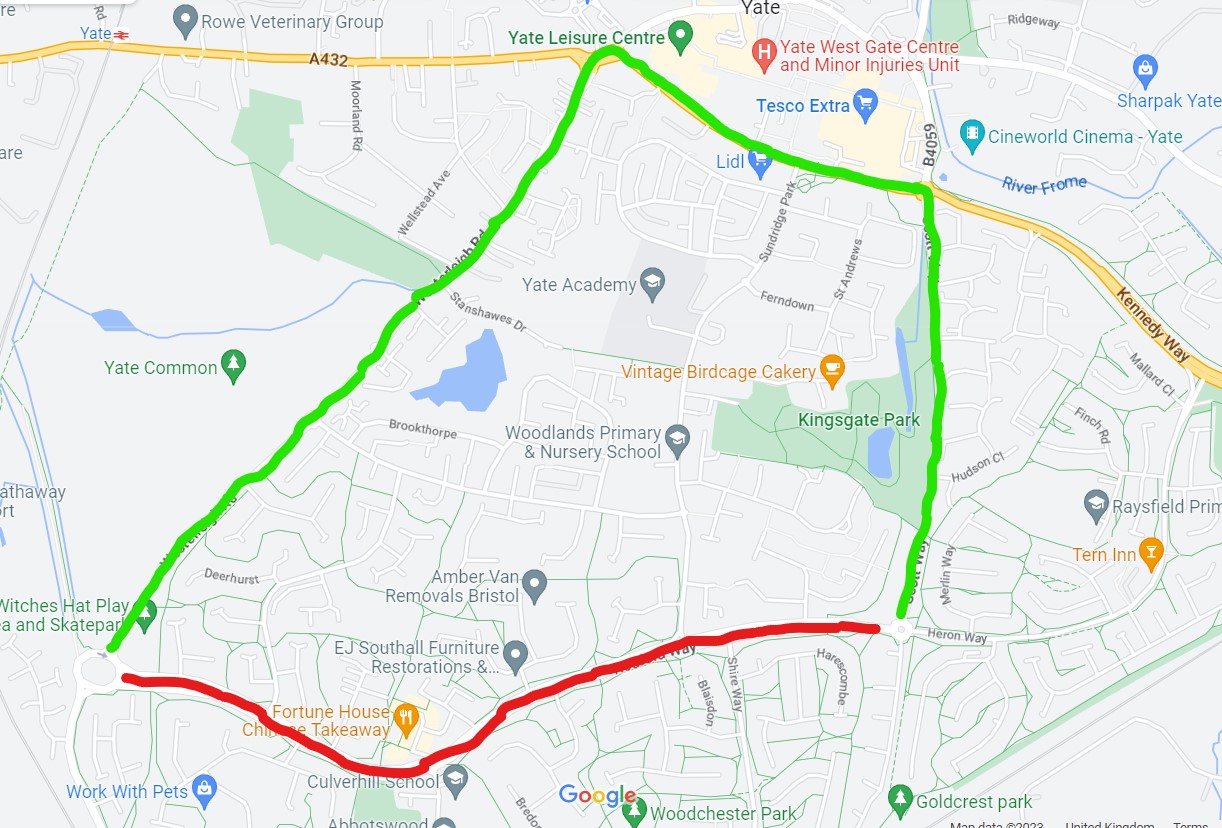 A map showing a diversion avoiding a road closure of Rodford Way - please call the office for details - 01454 866546