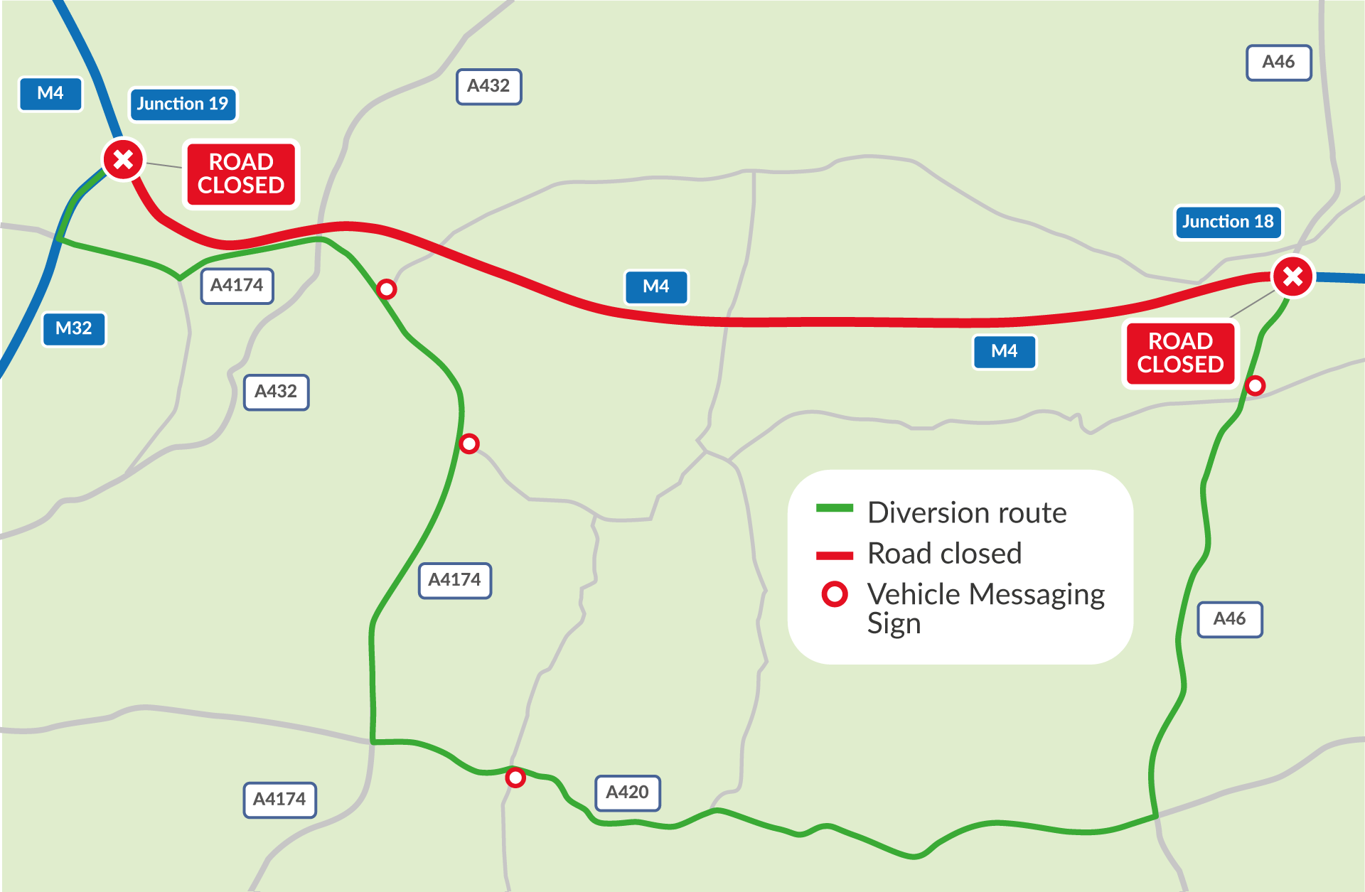 The M4 will be closed in both directions between junctions 18 and 19 from 7pm Friday 18 October to 6am Monday 21 October while a trench is dug under the motorway. This will allow utilities to be diverted that are currently within the bridge before the structure is demolished next year.